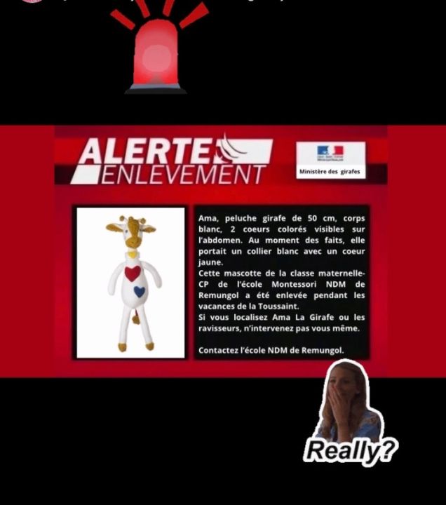 A leur arrivée en classe, les élèves ont constaté qu’Ama La Girafe, la mascotte de la classe des maternelles-CP, avait disparu. A la place, ils ont trouvé son sac et une lettre laissée par les ravisseurs. Une bien mauvaise surprise au retour des vacances ! Qui a bien pu s’introduire dans l’école ? Si vous avez des informations, n’hésitez pas à contacter l’école. 🤨.
